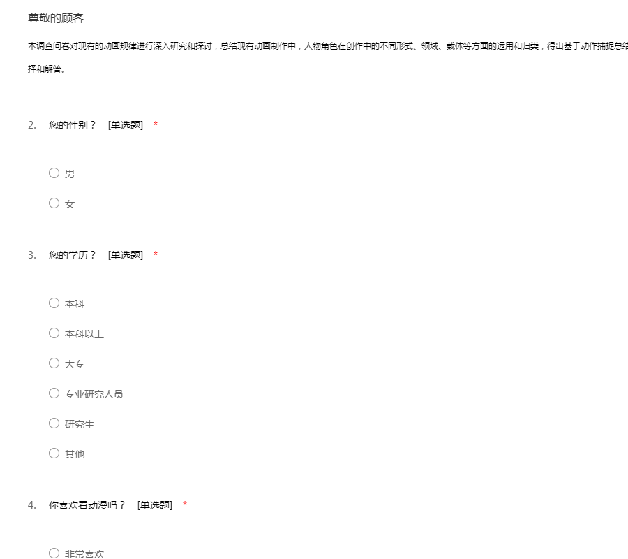 本调查问卷对现有的动画规律进行深入研究和探讨,总结现有动画制作中,人物角色在创作中的不同形式、领域、载体等方面的运用和归类,得出基于动作捕捉总结和归纳动作设计方法,请根据切身体会,做出选择和解答。