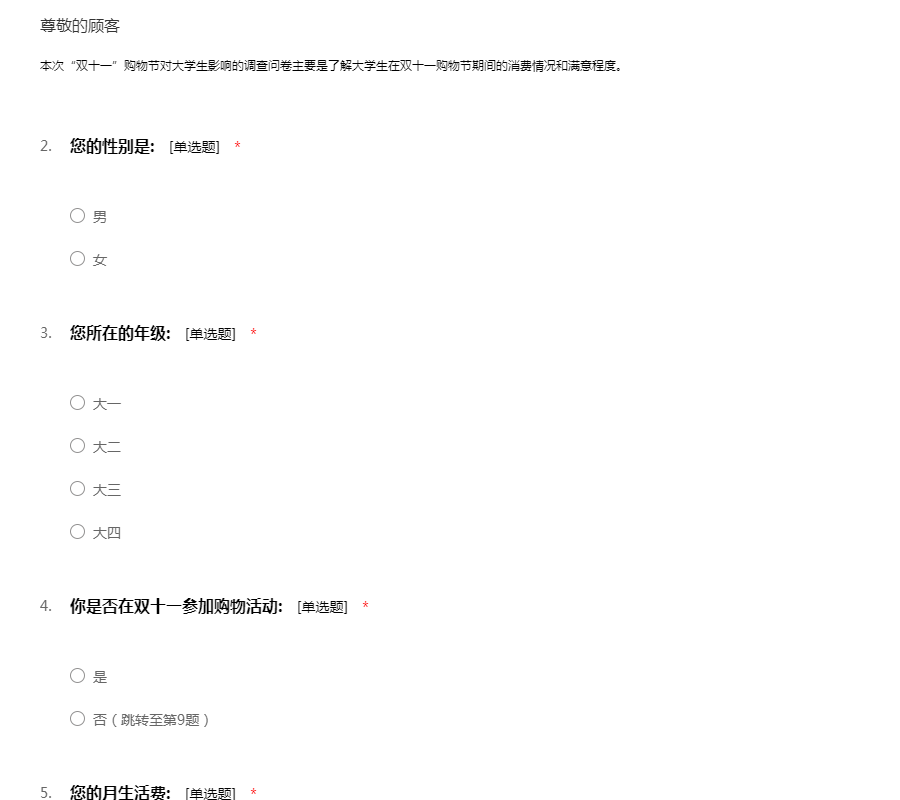 本次“双十一”购物节对大学生影响的调查问卷主要是了解大学生在双十一购物节期间的消费情况和满意程度。