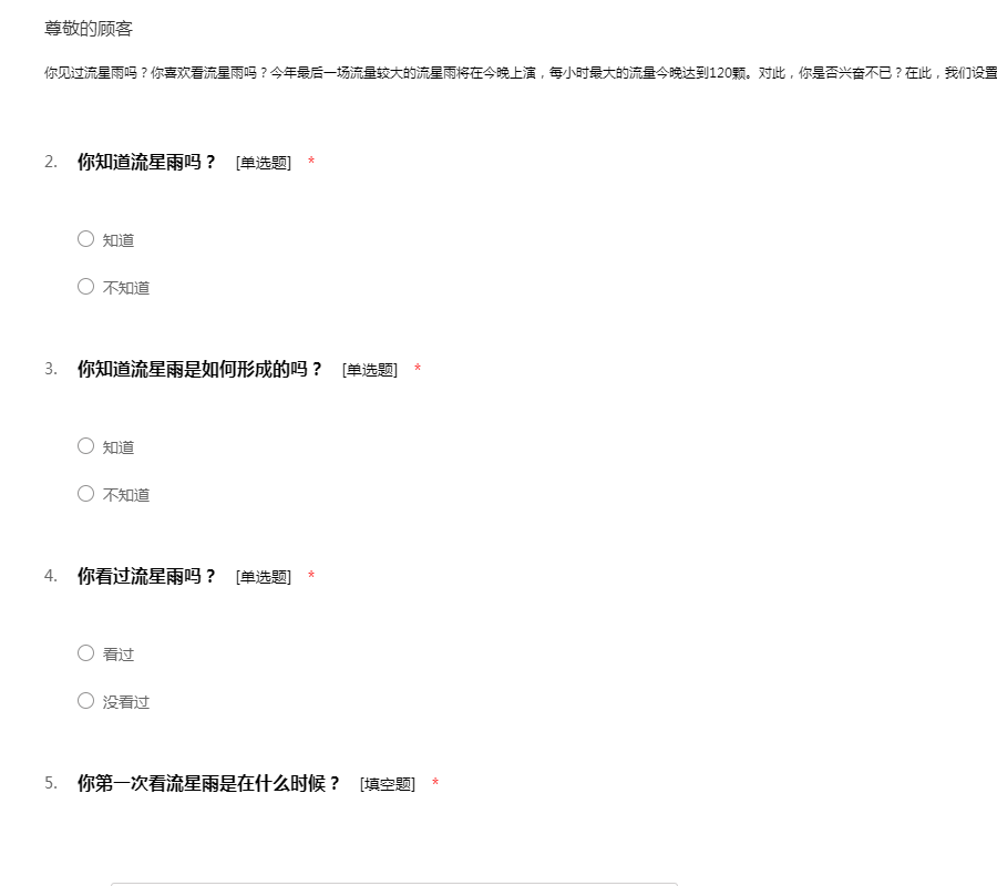 你见过流星雨吗?你喜欢看流星雨吗?今年最后一场流量较大的流星雨将在今晚上演,每小时最大的流量今晚达到120颗。对此,你是否兴奋不已?在此,我们设置了这份调查问卷,希望你可以来积极参加!