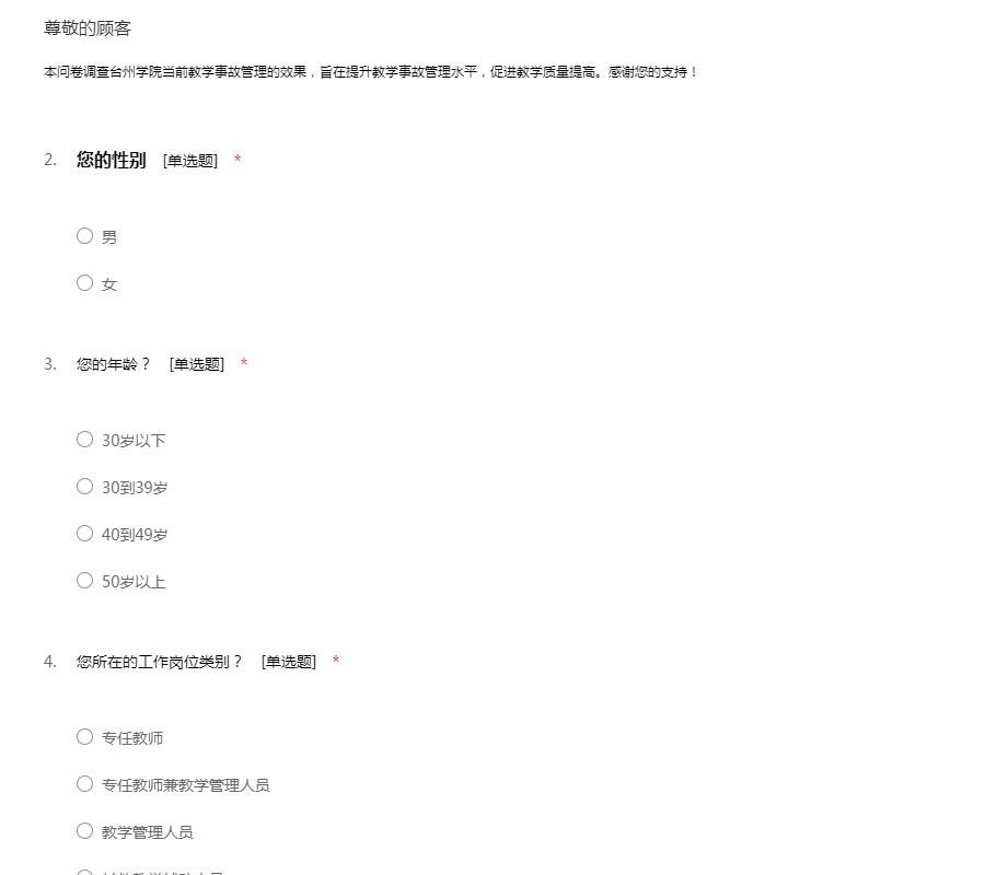 本问卷调查台州学院当前教学事故管理的效果,旨在提升教学事故管理水平,促进教学质量提高。感谢您的支持!