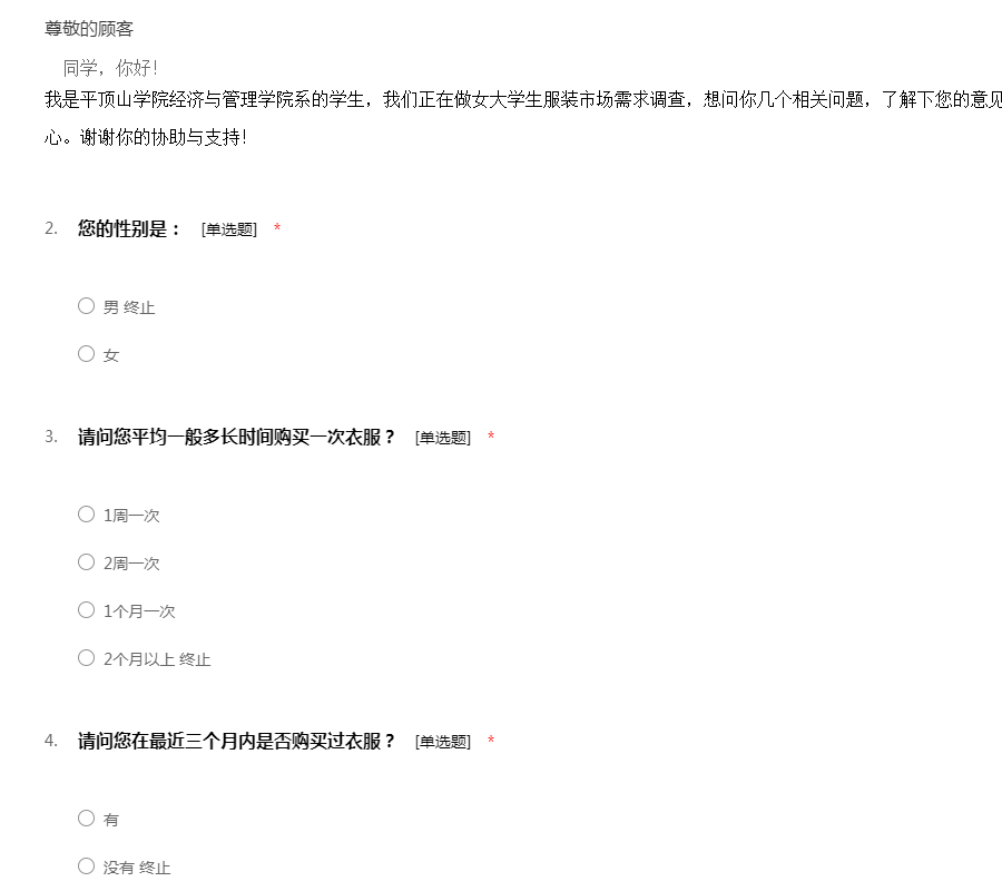 同学,你好! 我是平顶山学院经济与管理学院系的学生,我们正在做女大学生服装市场需求调查,想问你几个相关问题,了解下您的意见。您的回答将被完全保密,请放心。谢谢你的协助与支持!