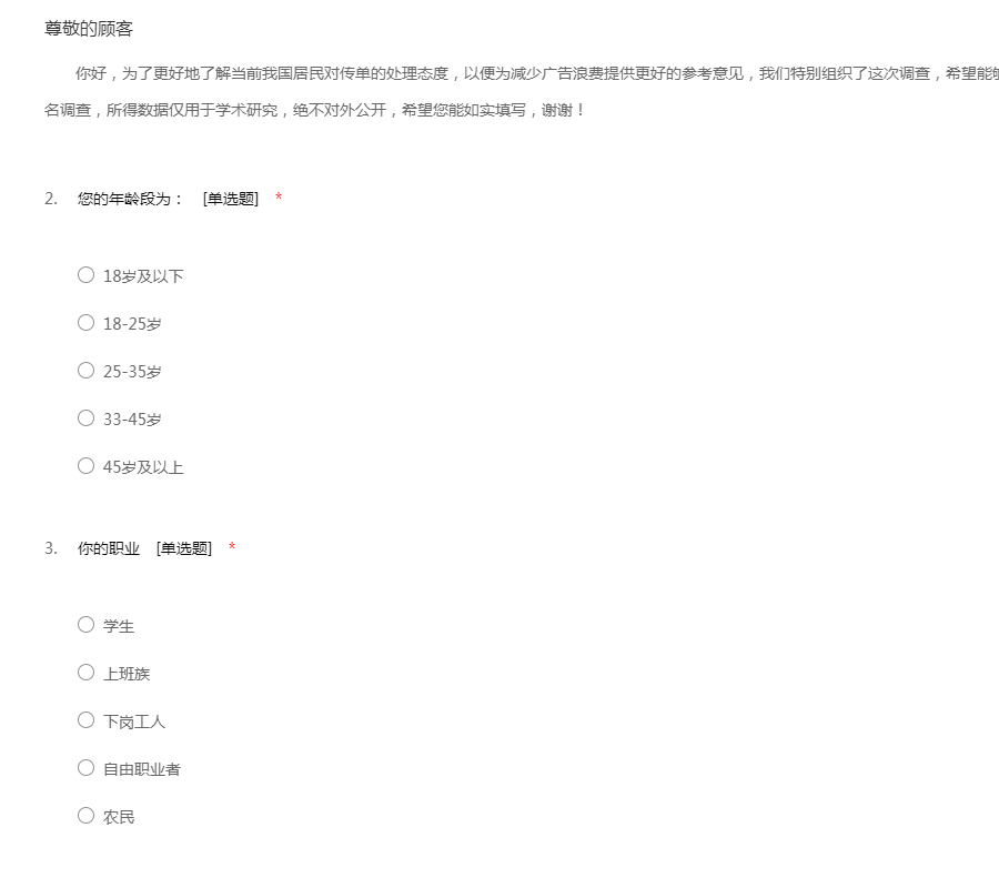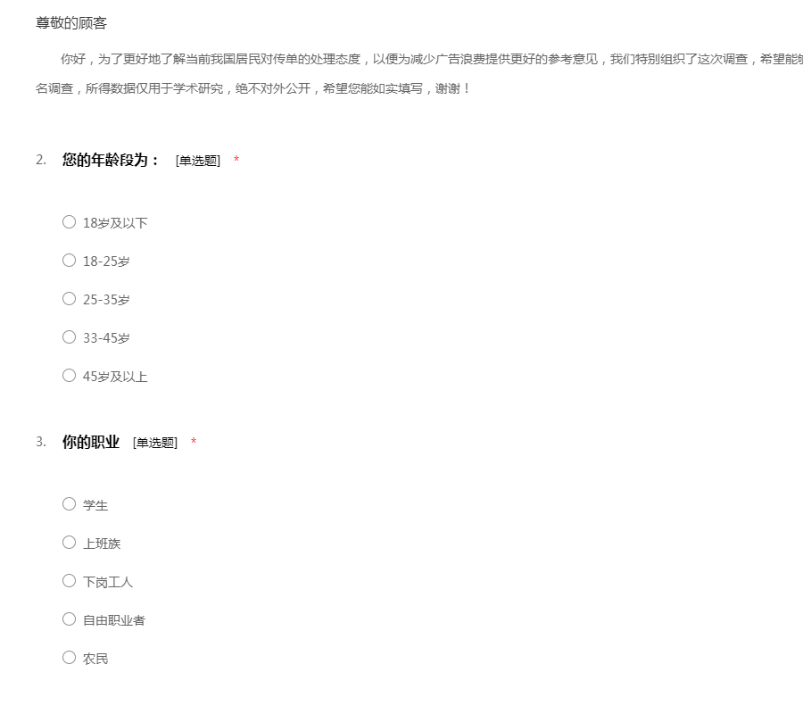 你好,为了更好地了解当前我国居民对传单的处理态度,以便为减少广告浪费提供更好的参考意见,我们特别组织了这次调查,希望能够得到您的支持与合作。本次调查为不记名调查,所得数据仅用于学术研究,绝不对外公开,希望您能如实填写,谢谢!