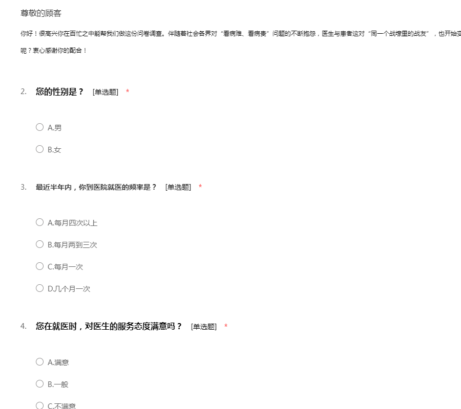 你好!很高兴你在百忙之中能帮我们做这份问卷调查。伴随着社会各界对“看病难、看病贵”问题的不断抱怨,医生与患者这对“同一个战壕里的战友”,也开始变得不再信任。请问你是怎样看待当前的医患关系呢?衷心感谢你的配合!
