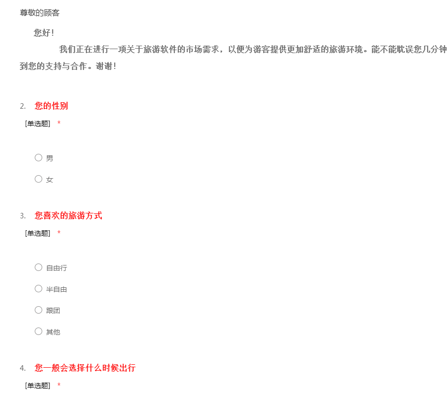 您好! 我们正在进行一项关于旅游软件的市场需求,以便为游客提供更加舒适的旅游环境。能不能耽误您几分钟的时间,请教您几个问题,希望得到您的支持与合作。谢谢!