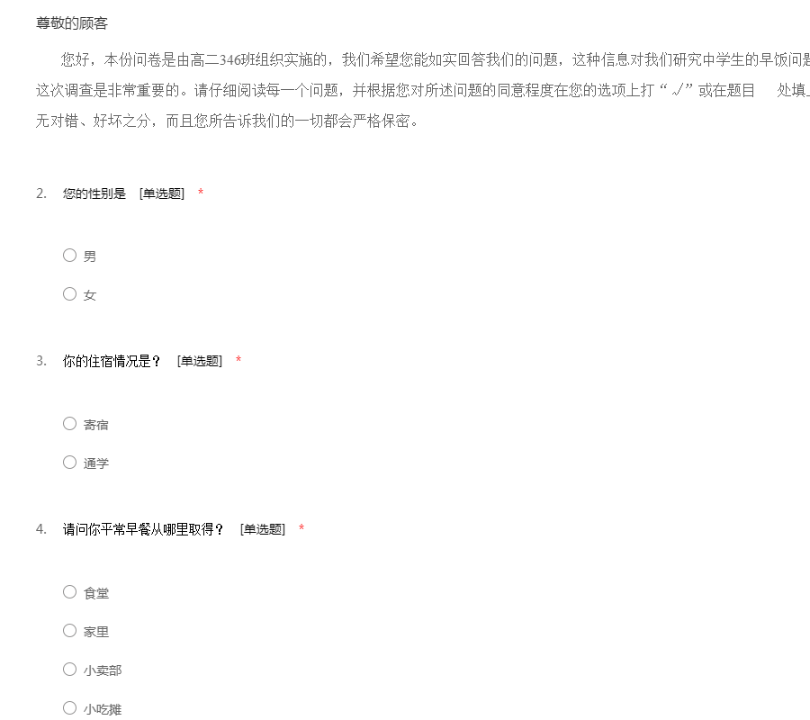您好,本份问卷是由高二346班组织实施的,我们希望您能如实回答我们的问题,这种信息对我们研究中学生的早饭问题是有很大帮助的,您的积极参与对这次调查是非常重要的。请仔细阅读每一个问题,并根据您对所述问题的同意程度在您的选项上打“√”或在题目 处填上适合自己情况的内容。本卷的答案无对错、好坏之分,而且您所告诉我们的一切都会严格保密。