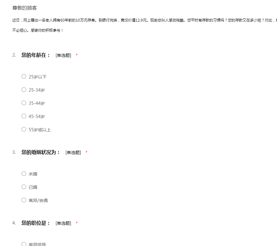 近日,网上曝出一名老人拥有60年前的10万元存单。到银行兑换,竟仅价值12.9元。现实总叫人感动残酷。您平时有存款的习惯吗?您的存款又在多少呢?对此,我们设计了这份我调查表。问卷不记名,所以请不必担心。感谢你的积极参与!