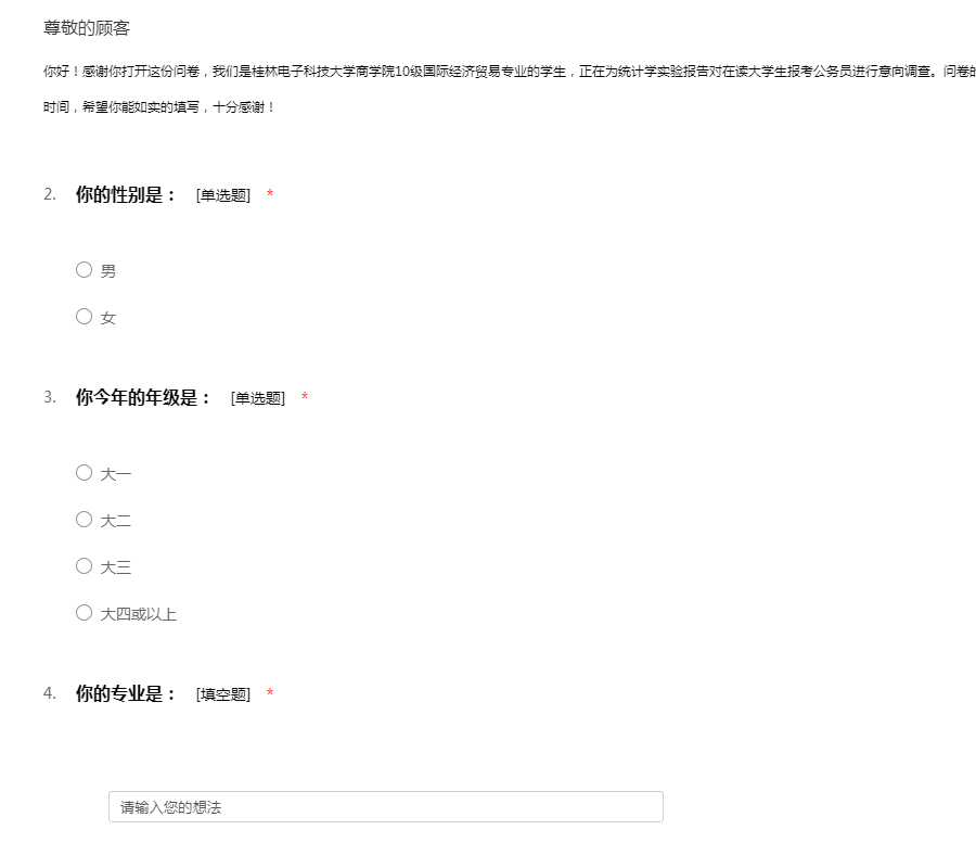 你好!感谢你打开这份问卷,我们是桂林电子科技大学商学院10级国际经济贸易专业的学生,正在为统计学实验报告对在读大学生报考公务员进行意向调查。问卷的问题可能有点复杂,需要花费你一至两分钟的时间,希望你能如实的填写,十分感谢!