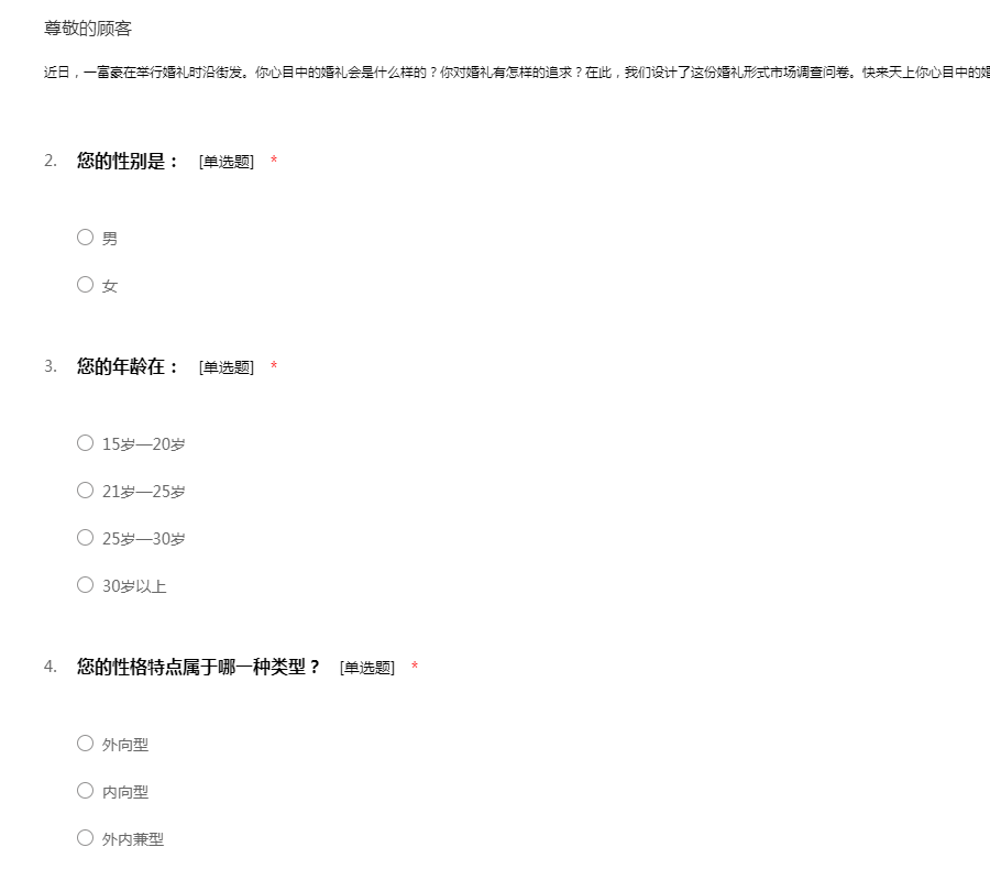 近日,一富豪在举行婚礼时沿街发。你心目中的婚礼会是什么样的?你对婚礼有怎样的追求?在此,我们设计了这份婚礼形式市场调查问卷。快来天上你心目中的婚礼吧!