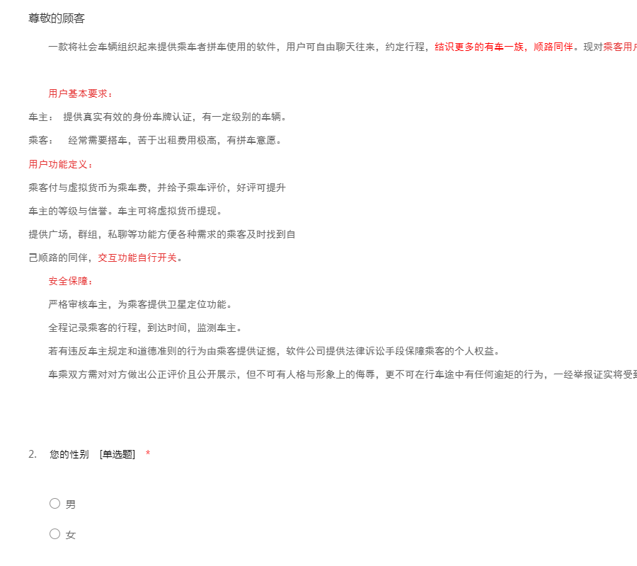 一款将社会车辆组织起来提供乘车者拼车使用的软件,用户可自由聊天往来,约定行程,结识更多的有车一族,顺路同伴。现对乘客用户的需求与看法做一份调研。
