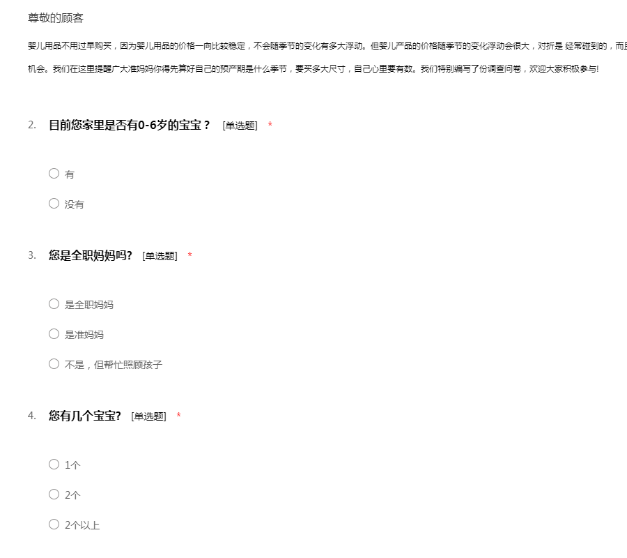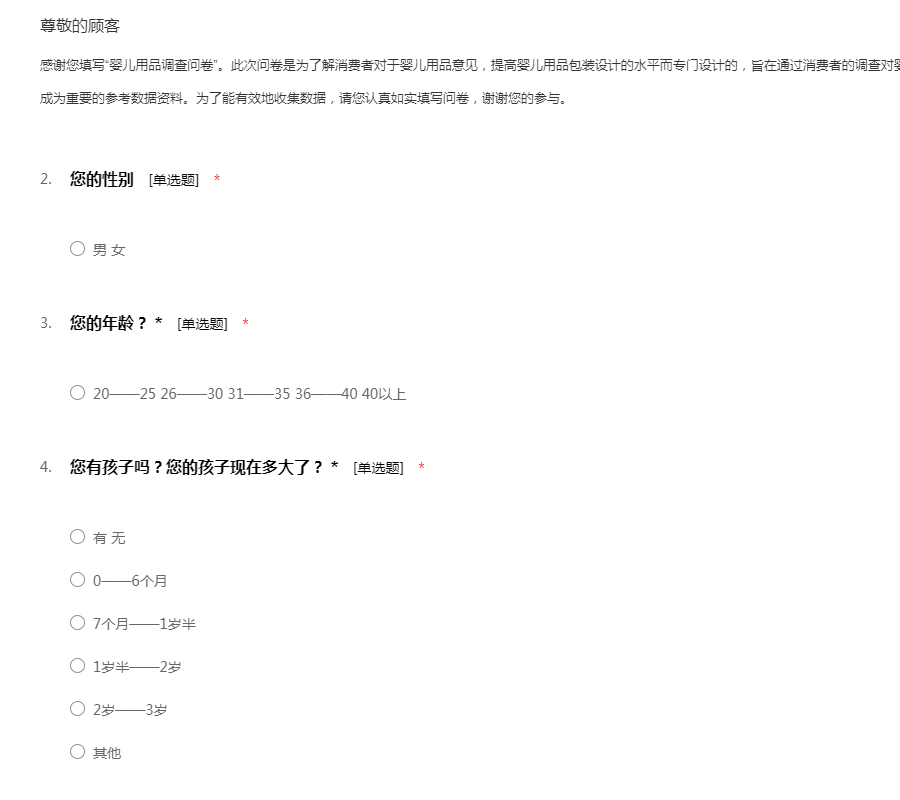 感谢您填写“婴儿用品调查问卷”。此次问卷是为了解消费者对于婴儿用品意见,提高婴儿用品包装设计的水平而专门设计的,旨在通过消费者的调查对婴儿用品包装设计进行改进,您的宝贵意见将成为重要的参考数据资料。为了能有效地收集数据,请您认真如实填写问卷,谢谢您的参与。