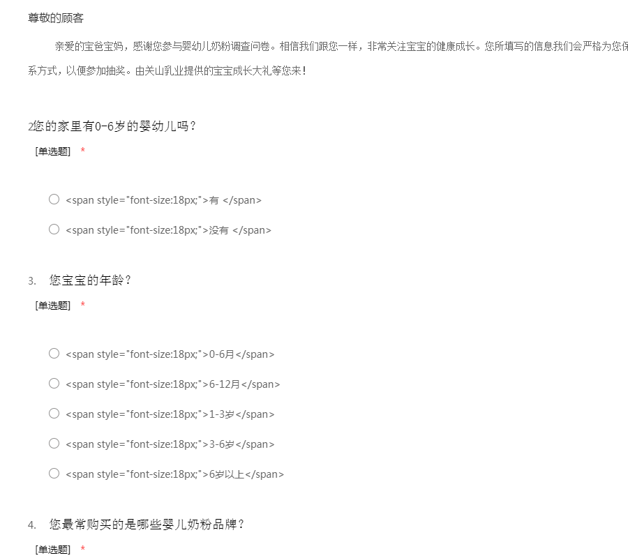 尊敬的朋友,我们正在进行一项关于婴幼儿奶粉的市场调查的问卷,此卷属于不记名填写,所涉及相关个人信息仅作为个人统计所用。非常感谢您的热心参与此项调查。