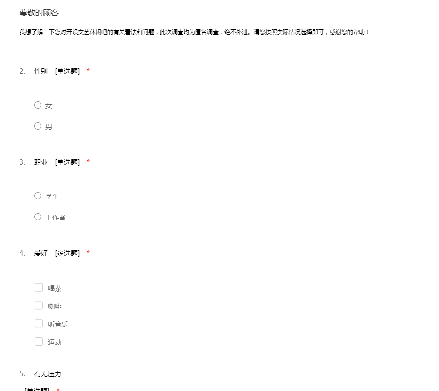 我想了解一下您对开设文艺休闲吧的有关看法和问题,此次调查均为匿名调查,绝不外泄。请您按照实际情况选择即可,感谢您的帮助!