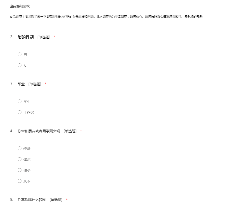 此次调查主要是想了解一下1您对开设休闲吧的有关看法和问题。此次调查均为匿名调查,请您放心。请您按照真实情况选择即可。感谢您的帮助!