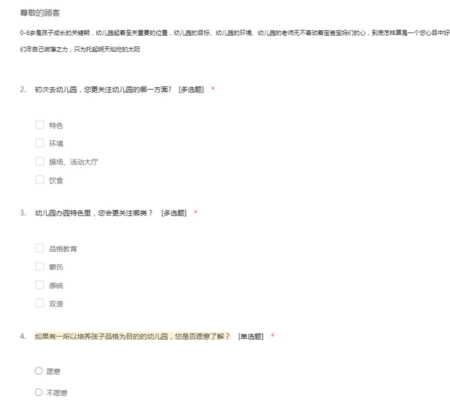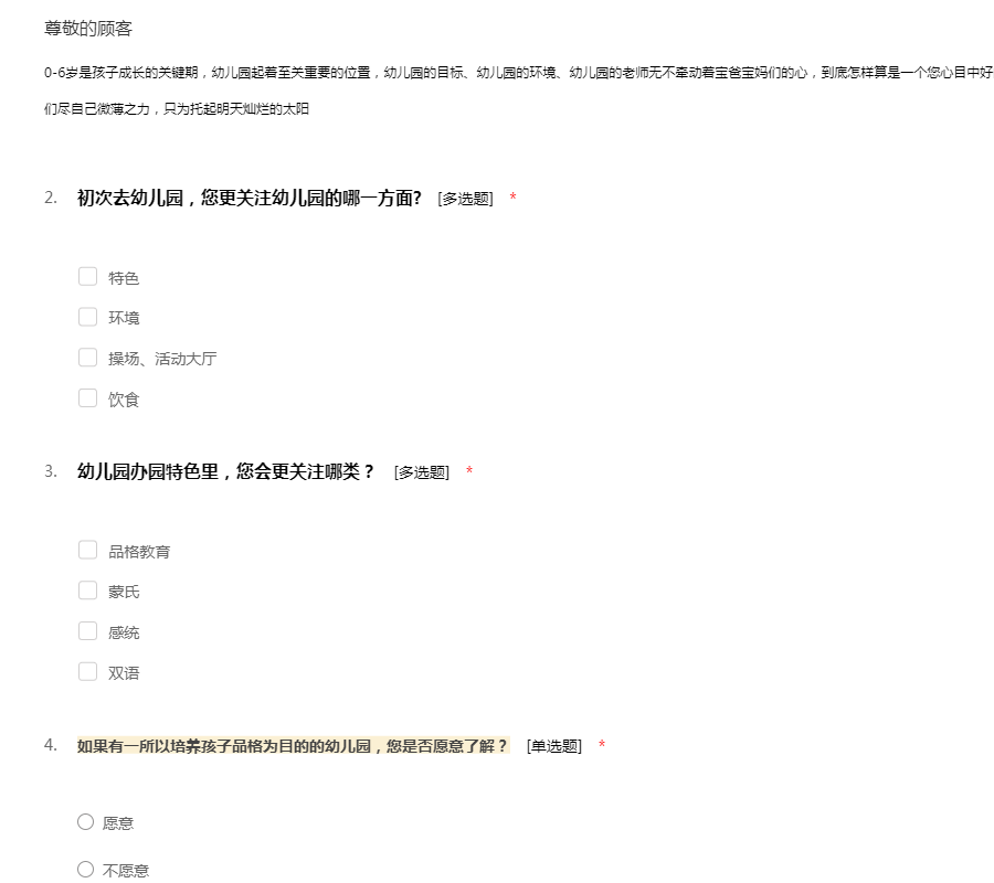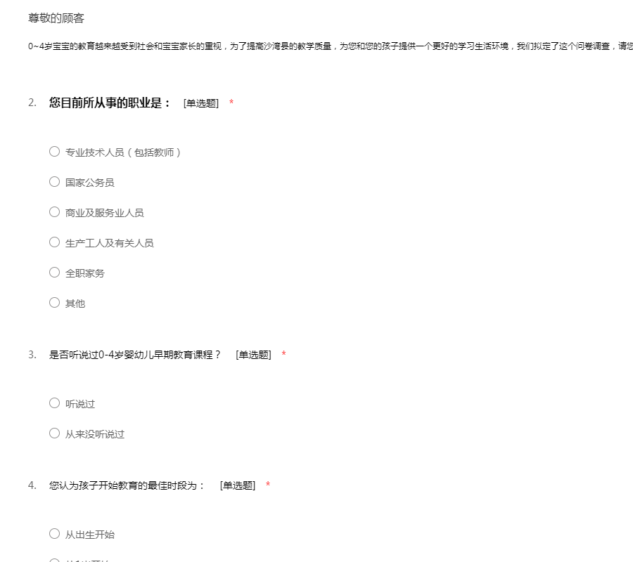 0~4岁宝宝的教育越来越受到社会和宝宝家长的重视,为了提高沙湾县的教学质量,为您和您的孩子提供一个更好的学习生活环境,我们拟定了这个问卷调查,请您认真如实填写,感谢您的大力支持和配合。