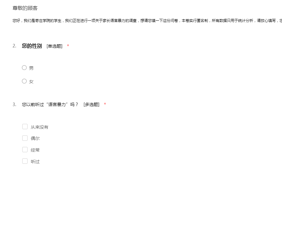 您好,我们是枣庄学院的学生,我们正在进行一项关于家长语言暴力的调查,想请您填一下这份问卷,本卷实行匿名制,所有数据只用于统计分析,请放心填写,您的意见对我们非常重要,请认真填写,谢谢!