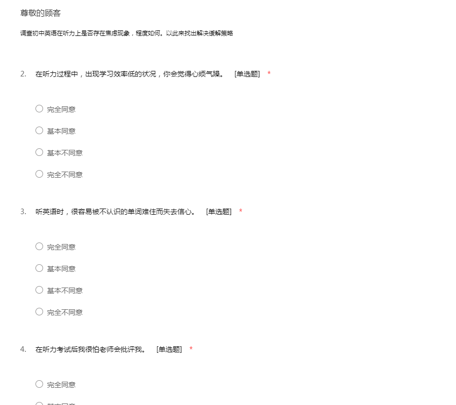 调查初中英语在听力上是否存在焦虑现象,程度如何。以此来找出解决缓解策略