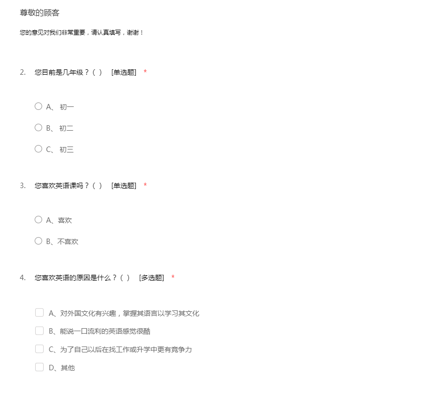 尊敬的各位家长,为了更好的对您的孩子进行更优质、更全面、更贴切的教育,我们特做了此次的调查问卷,请您认真选择回答,谢谢您的支持!