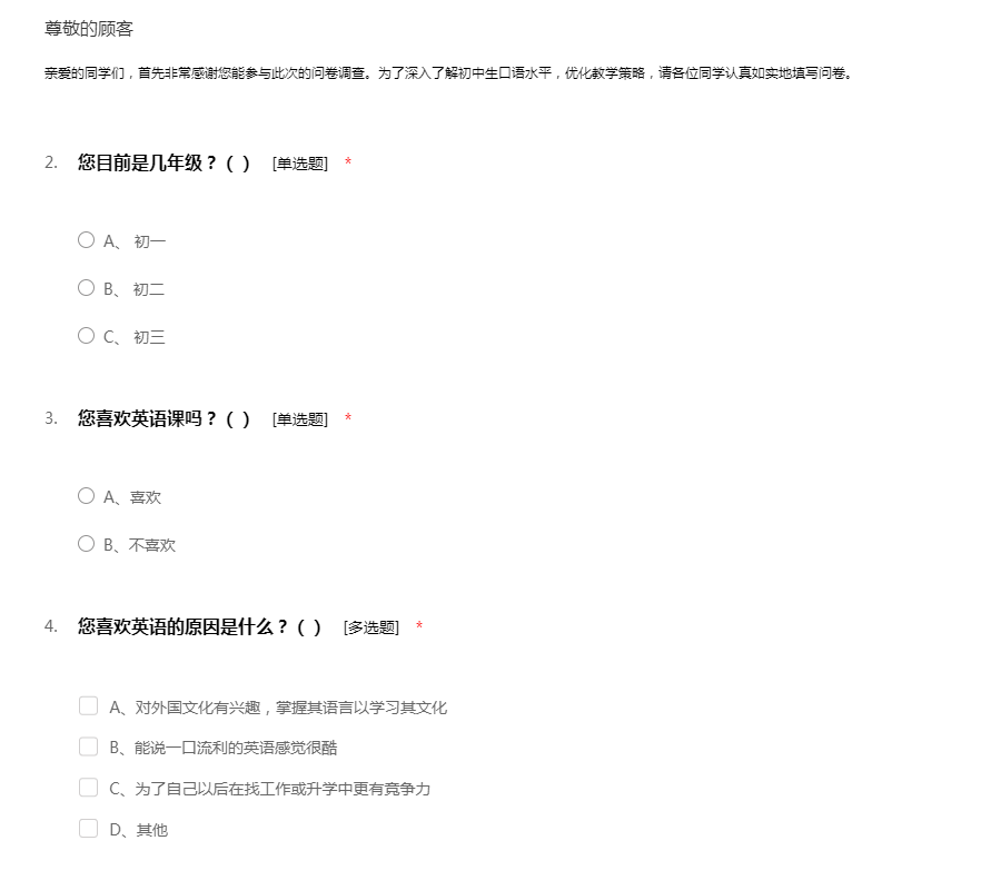 亲爱的同学们,首先非常感谢您能参与此次的问卷调查。为了深入了解初中生口语水平,优化教学策略,请各位同学认真如实地填写问卷。