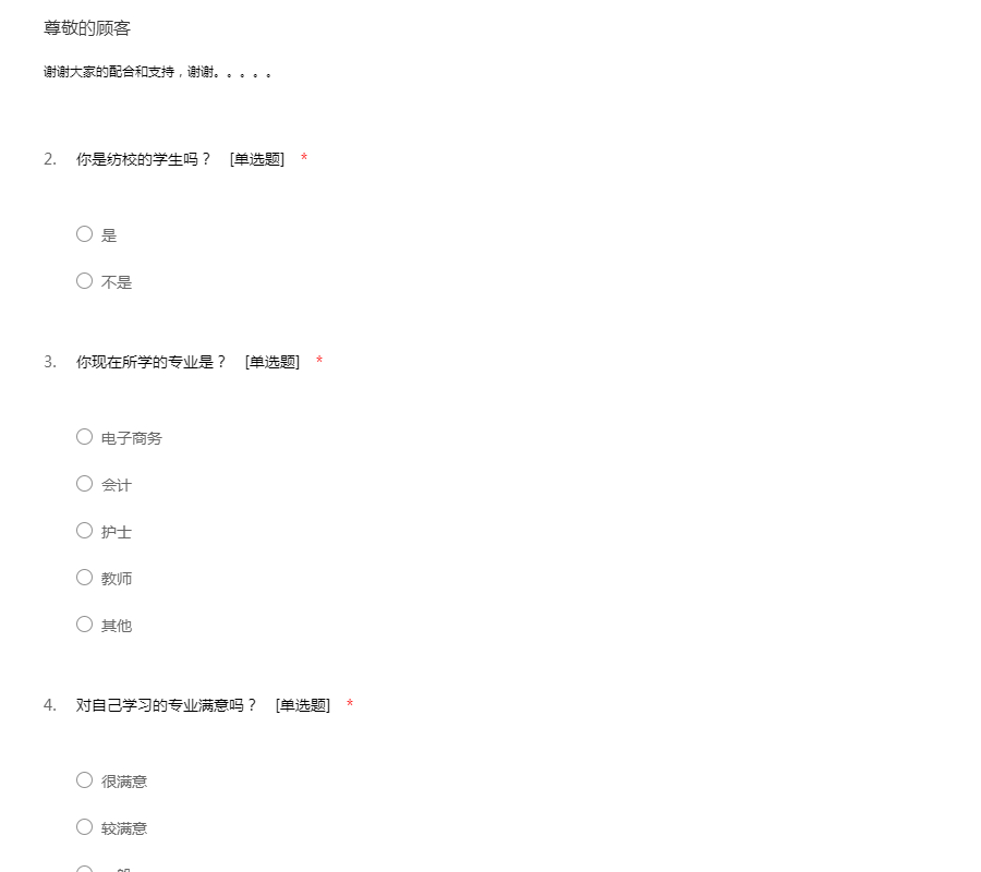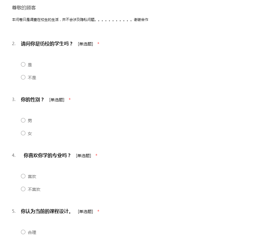 本问卷只是调查在校生的生活,并不会涉及隐私问题。。。。。。。。。。。谢谢合作
