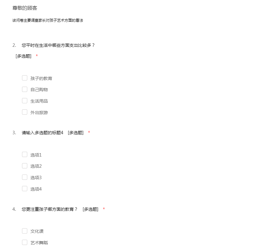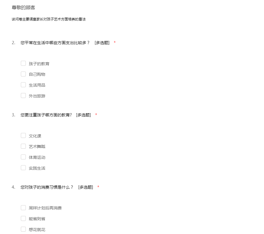 该问卷主要调查家长对孩子艺术方面培养的看法