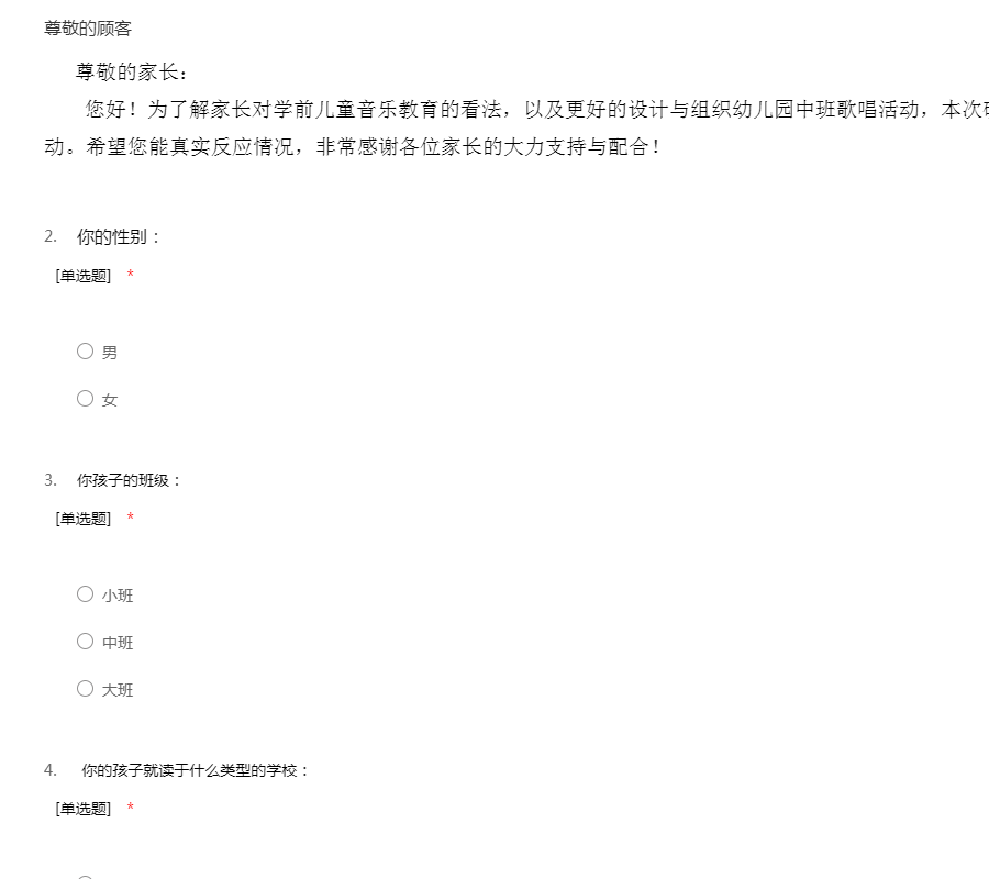 尊敬的家长:您好!为了解家长对学前儿童音乐教育的看法,以及更好的设计与组织幼儿园中班歌唱活动,本次研究采取问卷方式进行调查活动。希望您能真实反应情况,非常感谢各位家长的大力支持与配合!