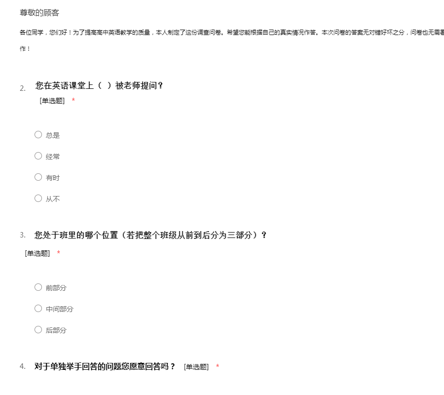各位同学,您们好!为了提高高中英语教学的质量,本人制定了这份调查问卷。希望您能根据自己的真实情况作答。本次问卷的答案无对错好坏之分,问卷也无需署名,您所提供的信息将会严格保密。谢谢您的合作!