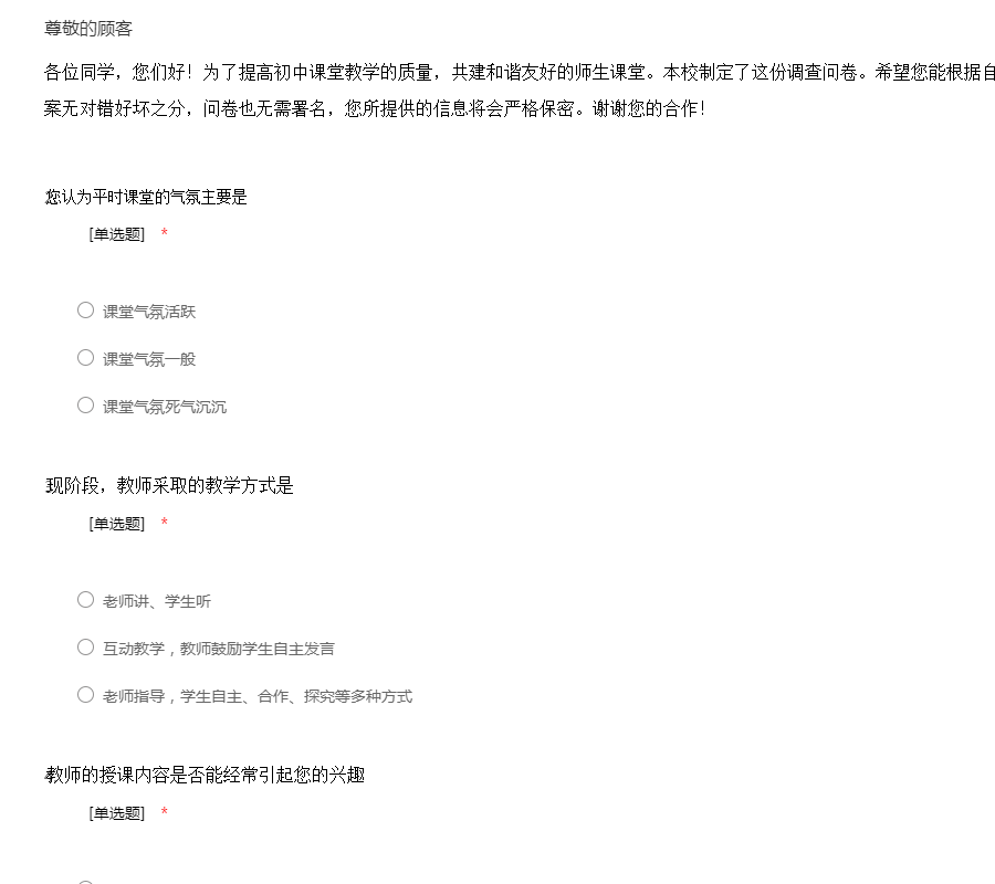 各位同学,您们好!为了提高初中课堂教学的质量,共建和谐友好的师生课堂。本校制定了这份调查问卷。希望您能根据自己的真实情况作答。本次问卷的答案无对错好坏之分,问卷也无需署名,您所提供的信息将会严格保密。谢谢您的合作!
