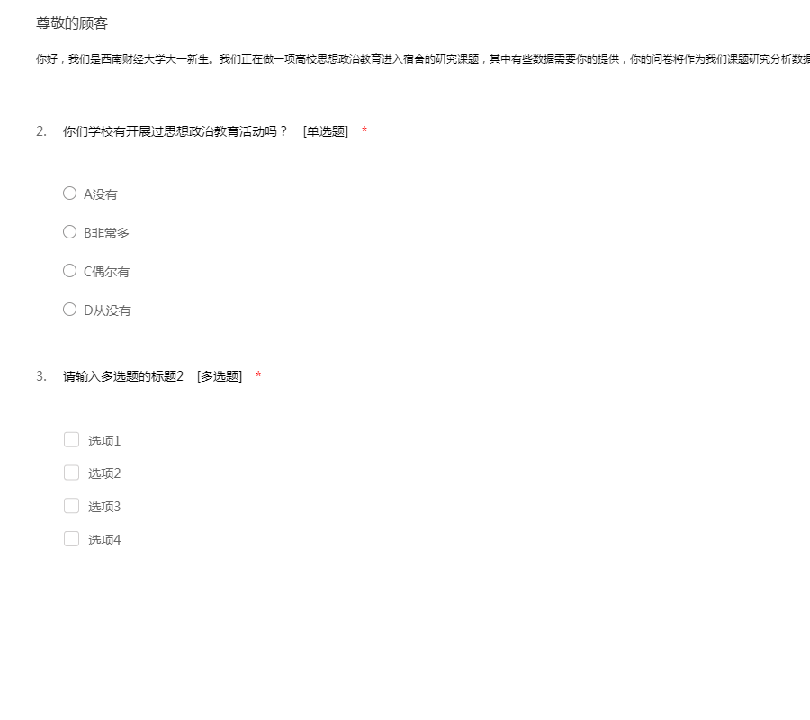 你好,我们是西南财经大学大一新生。我们正在做一项高校思想政治教育进入宿舍的研究课题,其中有些数据需要你的提供,你的问卷将作为我们课题研究分析数据。望你,认真填写问卷,感谢你的支持和参与。