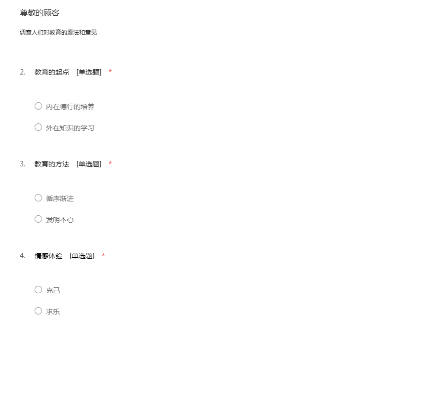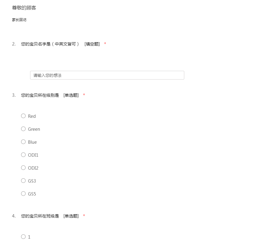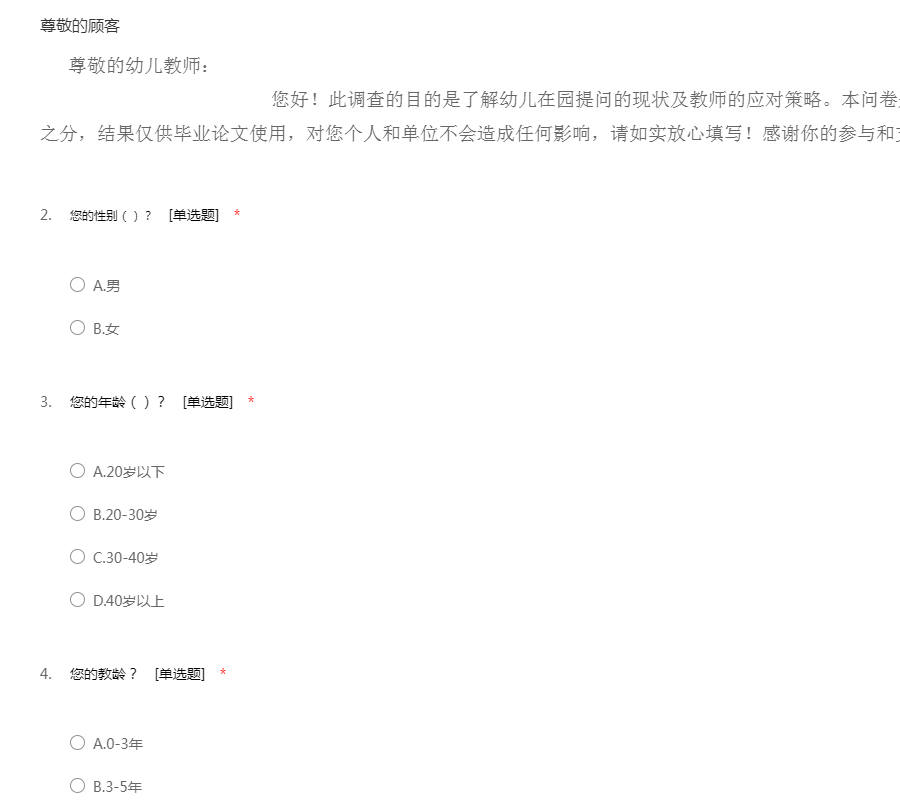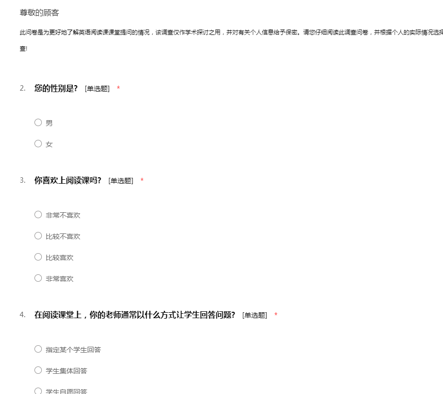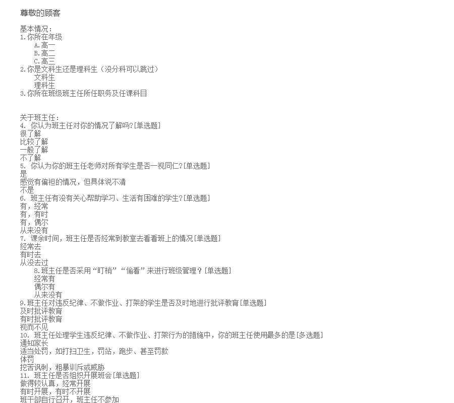 基本情况:1.你所在年级A.高一B.高二C.高三2.你是文科生还是理科生(没分科可以跳过)文科生理科生3.你所在班级班主任所任职务及任课科目 关于班主任:4. 你认为班主任对你的情况了解吗?[单选题]很了解 比较了解 一般了解 不了解 5. 你认为你的班主任老师对所有学生是否一视同仁?[单选题]是 感觉有偏袒的情况,但具体说不清 不是 6. 班主任有没有关心帮助学习、生活有困难的学生?[单选题]有,经常 有,有时 有,偶尔 从来没有7. 课余时间,班主任是否经常到教室去看看班上的情况[单选题]经常去 有时去 从没去过 8.班主任是否采用“盯梢”“偷看”来进行班级管理?[单选题]经常有偶尔有从来没有9.班主任对违反纪律、不做作业、打架的学生是否及时地进行批评教育[单选题]及时批评教育 有时批评教育 视而不见 10. 班主任处理学生违反纪律、不做作业、打架行为的措施中,你的班主任使用最多的是[多选题]通知家长 适当处罚,如打扫卫生,罚站,跑步、甚至罚款 体罚 挖苦讽刺,粗暴训斥或威胁11. 班主任是否组织开展班会[单选题]做得较认真,经常开展 有时开展,有时不开展班干部自行召开,班主任不参加基本没有开展 12. 班级组织的活动,班主任是否参加[单选题]经常参加 有时参加露个面就走了 从没参加 13. 学校组织的各类活动,班主任的态度如何?[单选题]组织大家积极参与 布置给班委做 班会上提一提,但不鼓励大家做 从没有提及或组织过 14. 就寝时,班主任是否经常到寝室里去关心学生的生活情况[单选题]每天去经常去 有时去 从没去过 15. 班主任与您( 家长 )经常沟通的方式是什么[单选题]打电话 便条 家访 16. 许多学生都害怕找家长,你的班主任老师在什么情况下会找你家长?[单选题]你屡犯错误不改时或你错误性质严重时 只要犯了错误就找 他生气时 17. 班主任是否重视做学生的思想工作,正确引导,耐心说服教育[单选题]经常做,方法得当 有时做 不知道只教知识不做思想工作18. 班主任是否有披衣服、穿拖鞋进教室的现象[单选题]一直是经常有有时有没有 关于学生:19. 你有困难是否想向班主任寻求帮助?[单选题]是 看情况 没想过否 20. 你是否从班主任处获得过生活和学习上的帮助?[单选题]其主动给予过帮助 向其要求帮助,并确实获得了 没想过要其帮助 向其要求帮助,但未获得 21.你是否会故意出难题来“刁难”你的班主任?经常会偶尔会被班主任训斥后从来不会22. 你如何评价自己与班主任的关系?[单选题]关系融洽、能给予切实帮助的长辈 关系较好、偶尔能提供帮助 关系一般的师生 关系冷漠、几乎不怎么见面的陌生人其他 23. 你和你的班主任老师单独谈过话吗?[单选题]谈过 没有谈过但问题已经解决 没什么好谈 24. 如果你犯了错误,你希望你的班主任老师的第一反应是?[单选题]耐心教育,并且鼓励我 严厉批评并且责罚我 不要管我 25.当你犯了错误被班主任严厉训斥后,你会意志消沉,萎靡不振知道自己不足,化作动力觉得无所谓26.你希望你的班主任除了传授知识,还应该扮演什么样的角色呢?