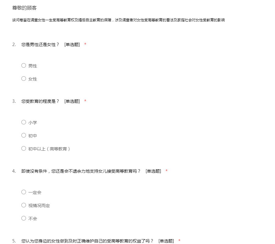该问卷旨在调查女性一生受高等教育权及婚后自主教育的保障,涉及调查者对女性受高等教育的看法及家庭社会对女性受教育的影响