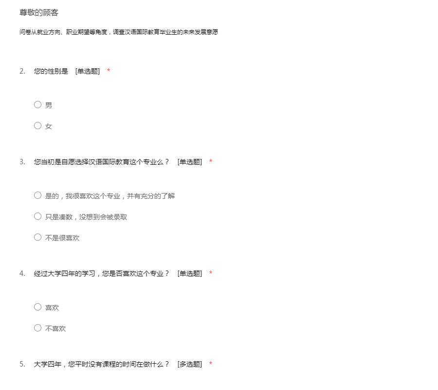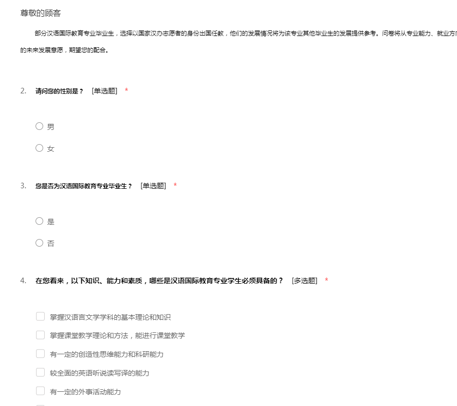 部分汉语国际教育专业毕业生,选择以国家汉办志愿者的身份出国任教,他们的发展情况将为该专业其他毕业生的发展提供参考。问卷将从专业能力、就业方向、职业期望等方面,调查汉语国际教育毕业生的未来发展意愿,期望您的配合。