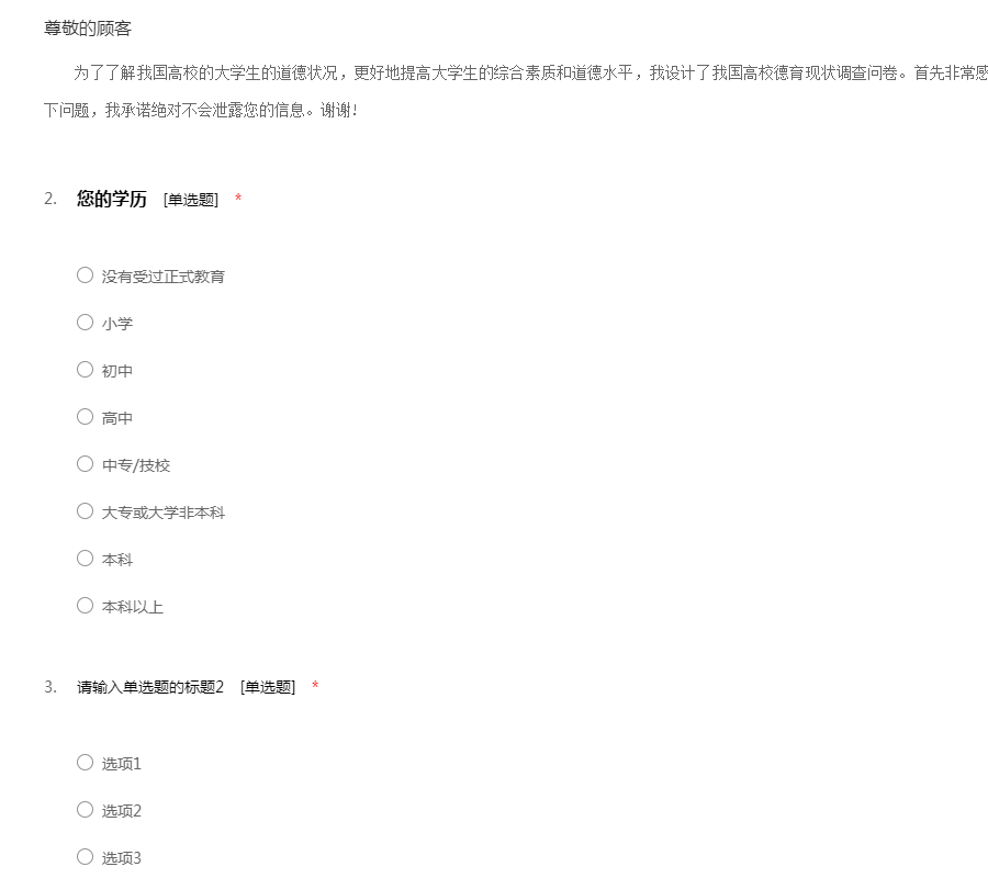 为了了解我国高校的大学生的道德状况,更好地提高大学生的综合素质和道德水平,我设计了我国高校德育现状调查问卷。首先非常感谢您的配合与帮助,请按实际情况回答以下问题,我承诺绝对不会泄露您的信息。谢谢!