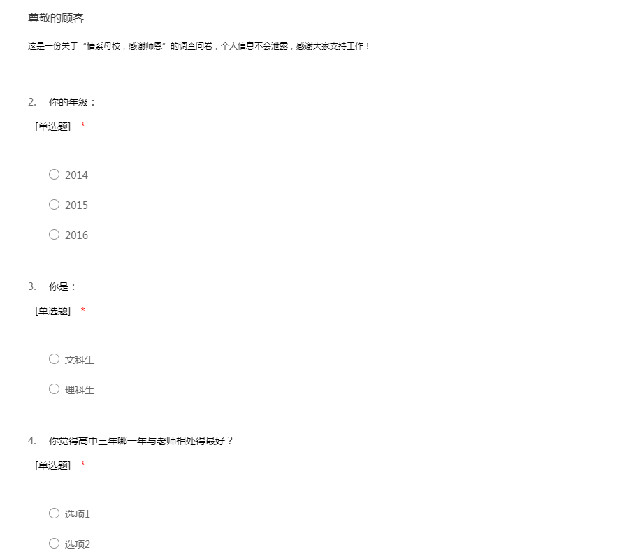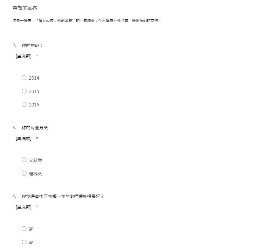 这是一份关于“情系母校,感谢师恩”的调查问卷,个人信息不会泄露,感谢大家支持工作!