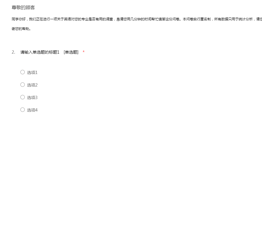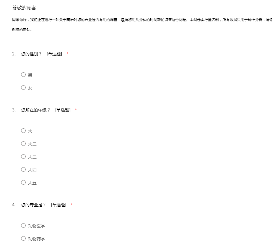 同学你好,我们正在进行一项关于英语对您的专业是否有用的调查,恳请您用几分钟的时间帮忙填答这份问卷。本问卷实行匿名制,所有数据只用于统计分析,请您放心填写。请您按照自己的实际情况 填写,谢谢您的帮助。