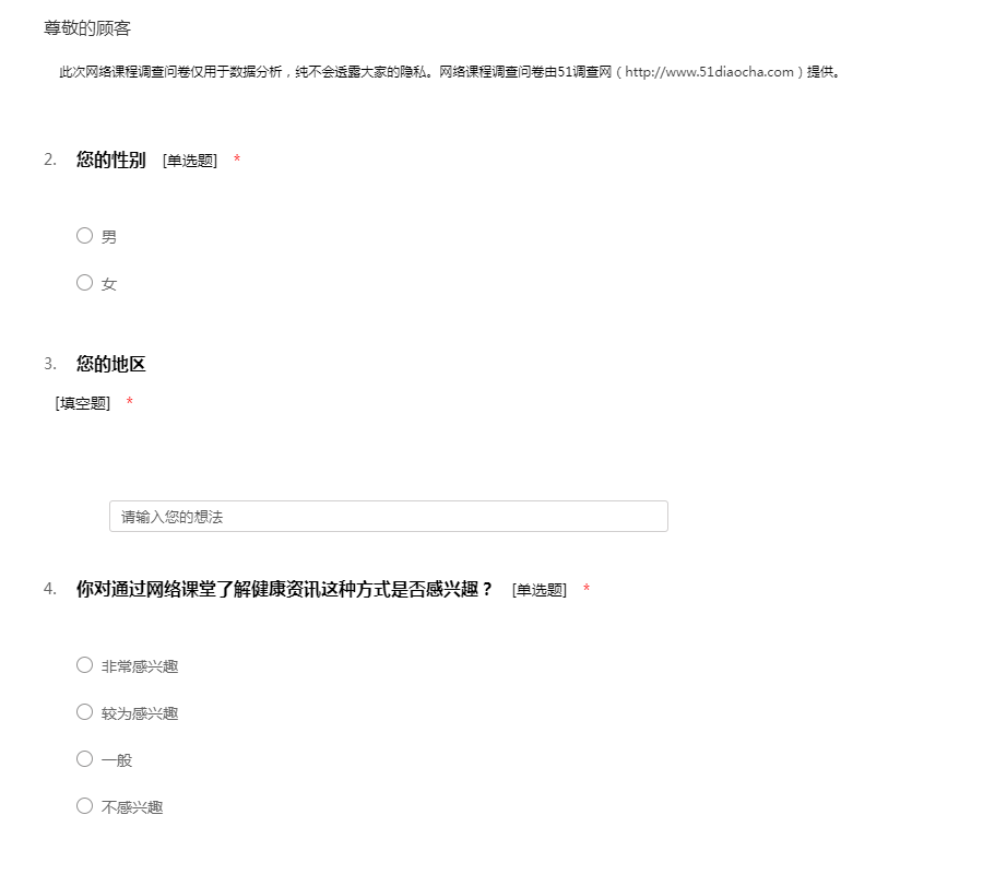 此次网络课程调查问卷仅用于数据分析,纯不会透露大家的隐私。网络课程调查问卷由51调查网(http://www.51diaocha.com)提供。