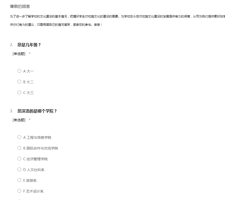 为了进一步了解学校的文化建设的基本情况,把握好学生对校园文化的建设的需要。为学校在今后对校园文化建设的发展提供有力的保障,从而为我们提供更好地学习环境奠定基础,希望占用你们几分钟时间,提供你们有力的建议,只需根据自己的情况填写,感谢您的参与。谢谢!