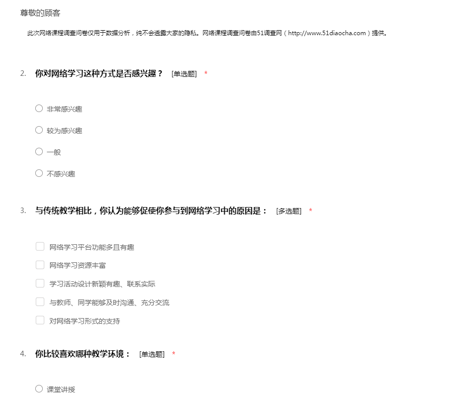此次网络课程调查问卷仅用于数据分析,纯不会透露大家的隐私。网络课程调查问卷由51调查网(http://www.51diaocha.com)提供。