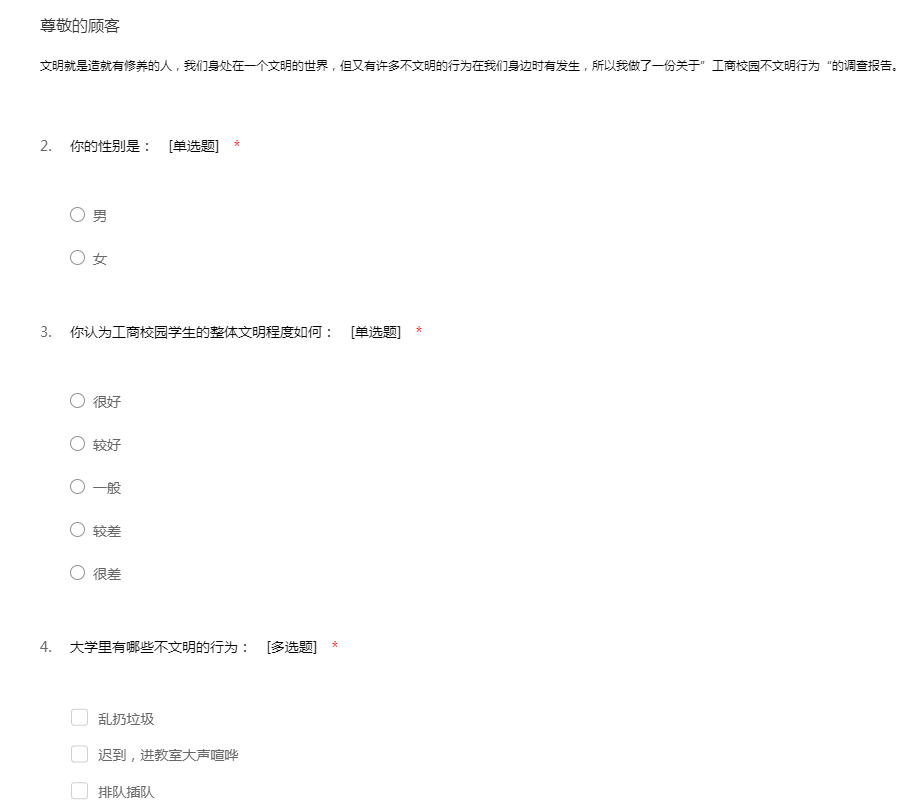 文明就是造就有修养的人,我们身处在一个文明的世界,但又有许多不文明的行为在我们身边时有发生,所以我做了一份关于”工商校园不文明行为“的调查报告。请你们认真填写,谢谢合作!