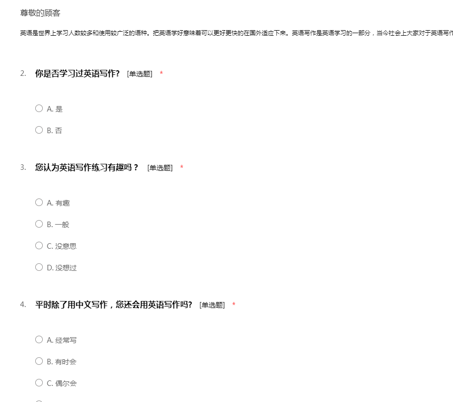英语是世界上学习人数较多和使用较广泛的语种。把英语学好意味着可以更好更快的在国外适应下来。英语写作是英语学习的一部分,当今社会上大家对于英语写作的学习情况如何?本问卷进行调查。