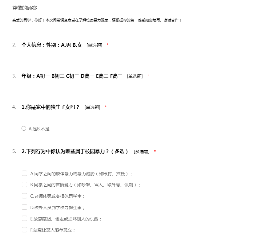 亲爱的同学:你好!本次问卷调查意旨在了解校园暴力现象,请根据你的第一感受如实填写。谢谢合作!