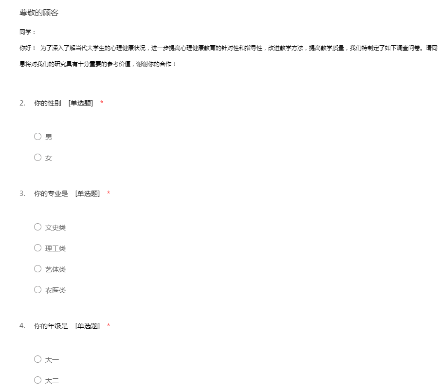 同学:你好! 为了深入了解当代大学生的心理健康状况,进一步提高心理健康教育的针对性和指导性,改进教学方法,提高教学质量,我们特制定了如下调查问卷。请同学们根据自己的真实想法认真填写,你的反馈信息将对我们的研究具有十分重要的参考价值,谢谢你的合作!