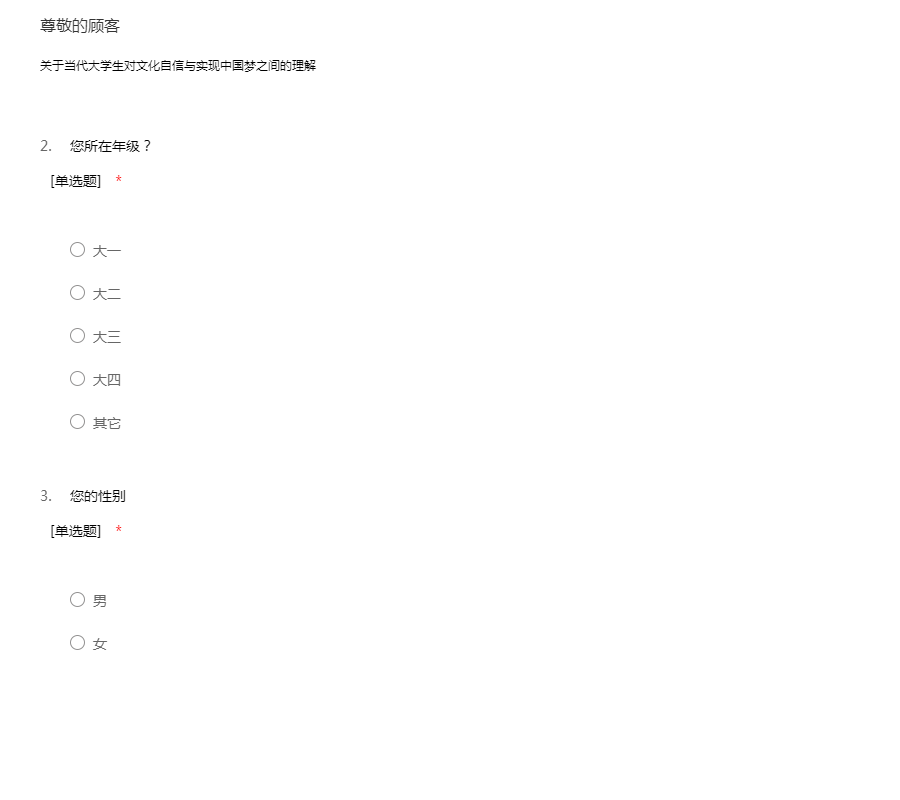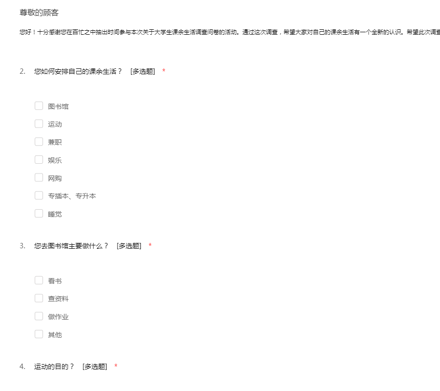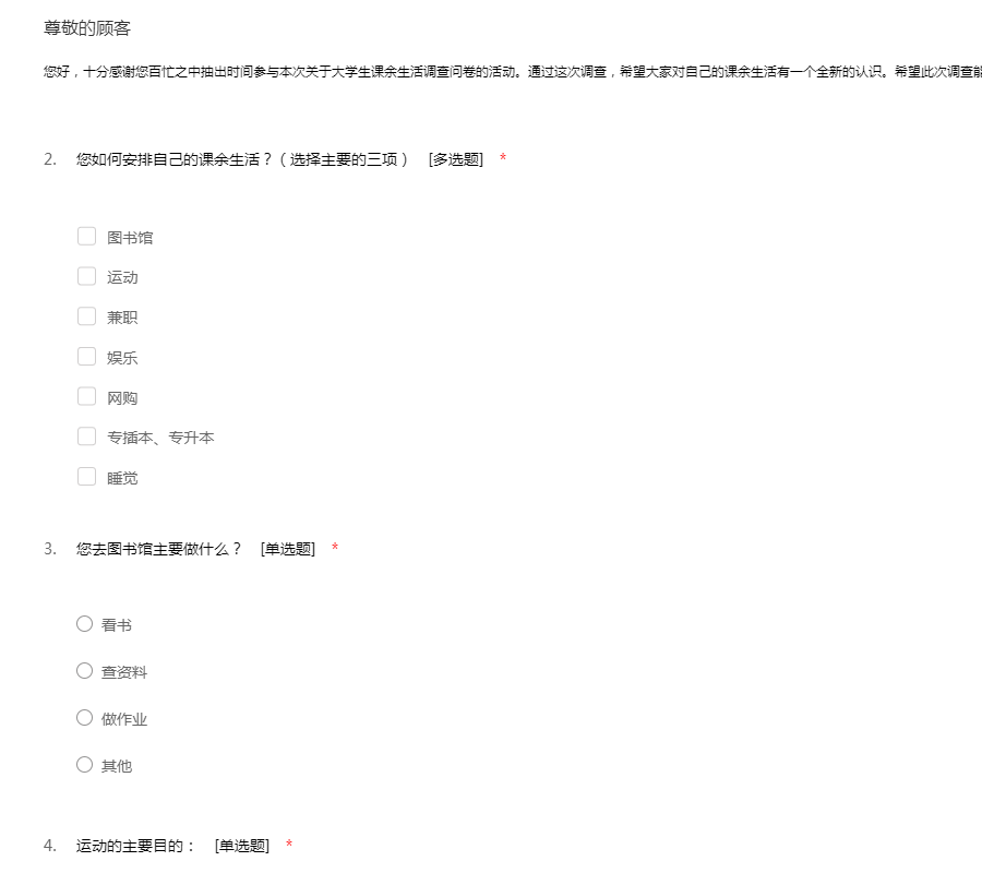 您好,十分感谢您百忙之中抽出时间参与本次关于大学生课余生活调查问卷的活动。通过这次调查,希望大家对自己的课余生活有一个全新的认识。希望此次调查能得到您的支持和帮助*^_^*