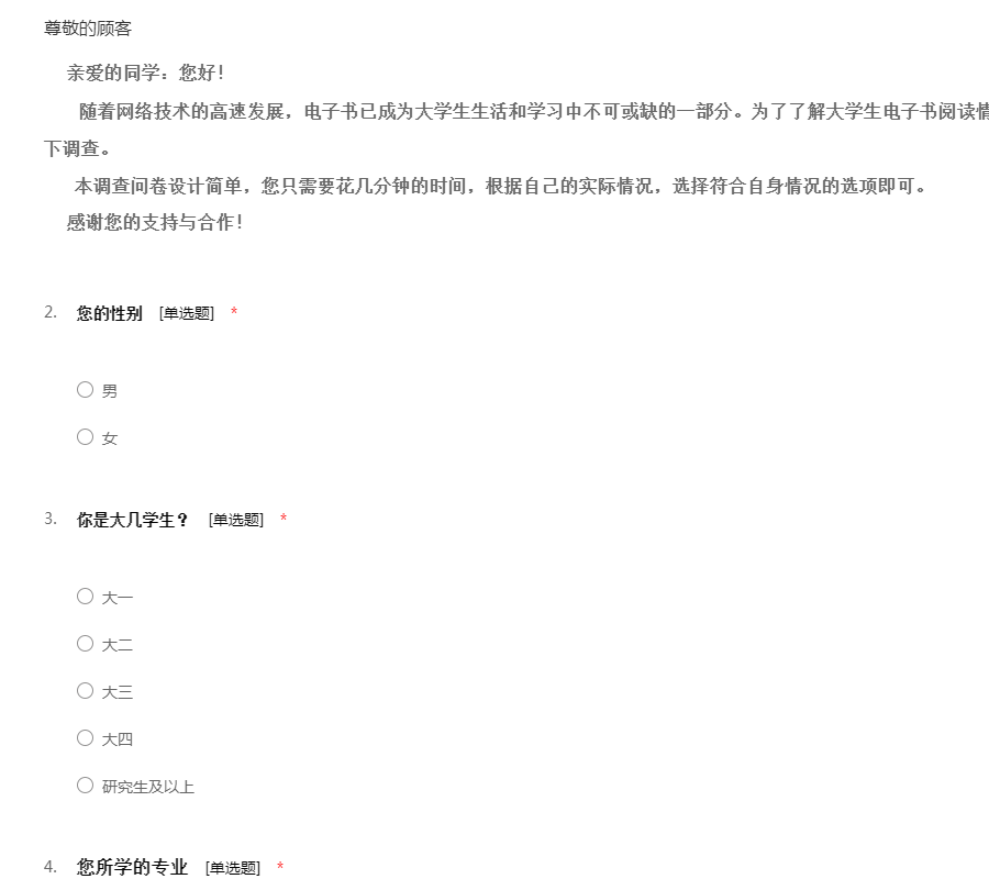 亲爱的同学:您好! 随着网络技术的高速发展,电子书已成为大学生生活和学习中不可或缺的一部分。为了了解大学生电子书阅读情况,我们针对电子阅读产品进行以下调查。 本调查问卷设计简单,您只需要花几分钟的时间,根据自己的实际情况,选择符合自身情况的选项即可。 感谢您的支持与合作!