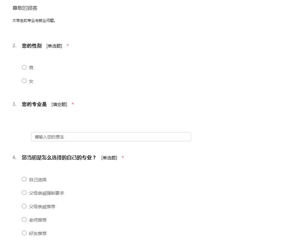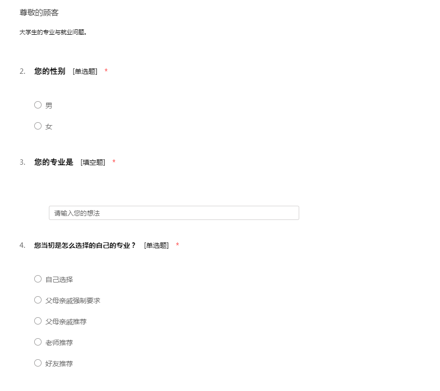 同学们好!明年的你将大学毕业,迈向新的人生旅程。为了进一步了解您的择业意向,让我们的就业指导和服务工作更加实用有效,我们设计了本问卷,希望得到你的支持。本问卷用于对我们改进就业工作而进行的统计分析,不会给你个人带来任何不利影响,请实事求是地回答,非常感谢你的支持与合作!