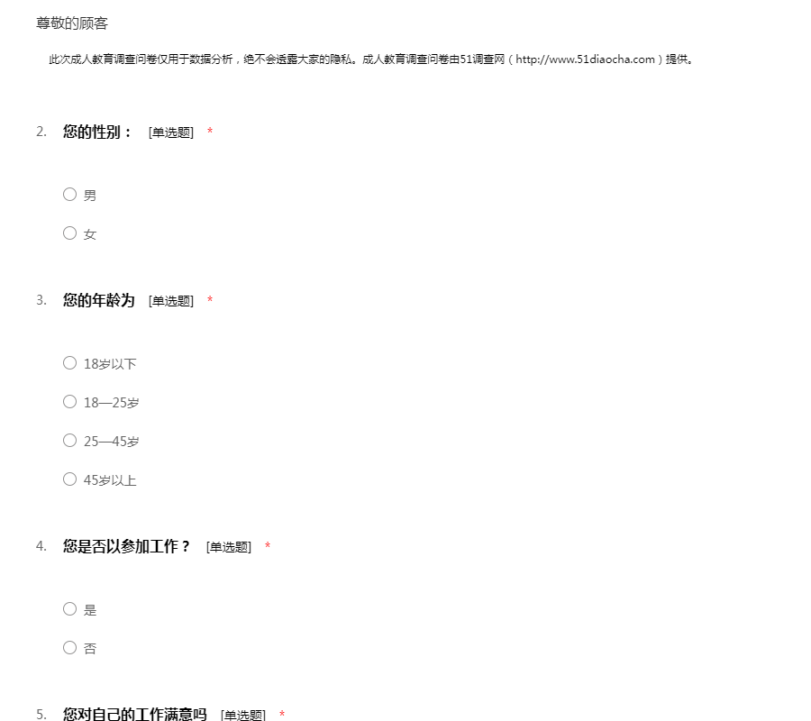 此次成人教育调查问卷仅用于数据分析,绝不会透露大家的隐私。成人教育调查问卷由51调查网(http://www.51diaocha.com)提供。
