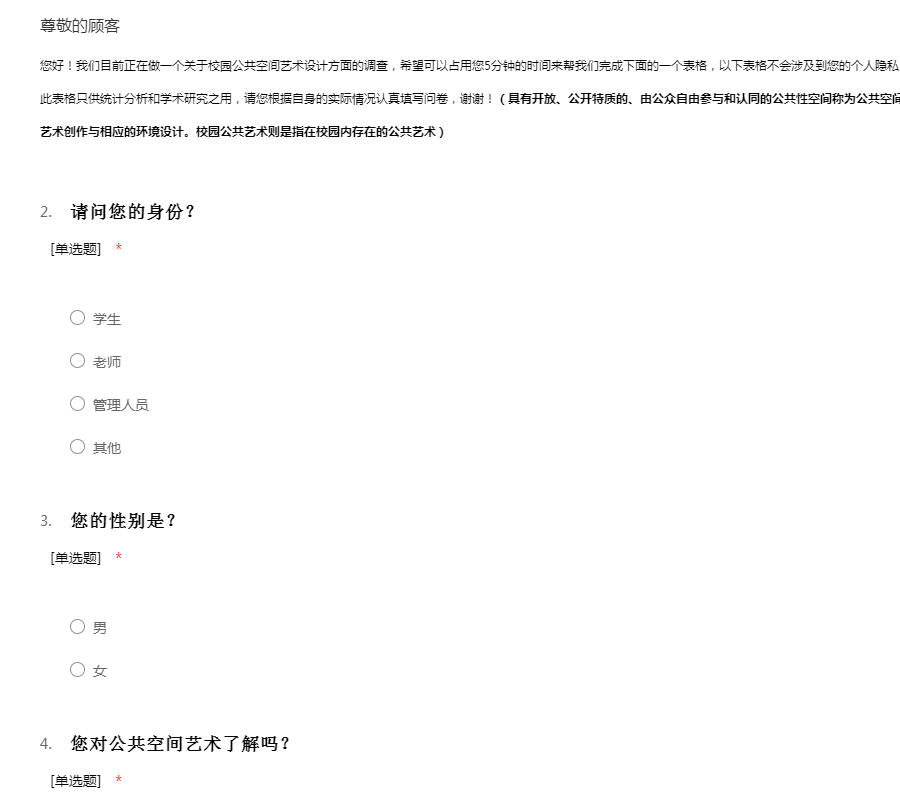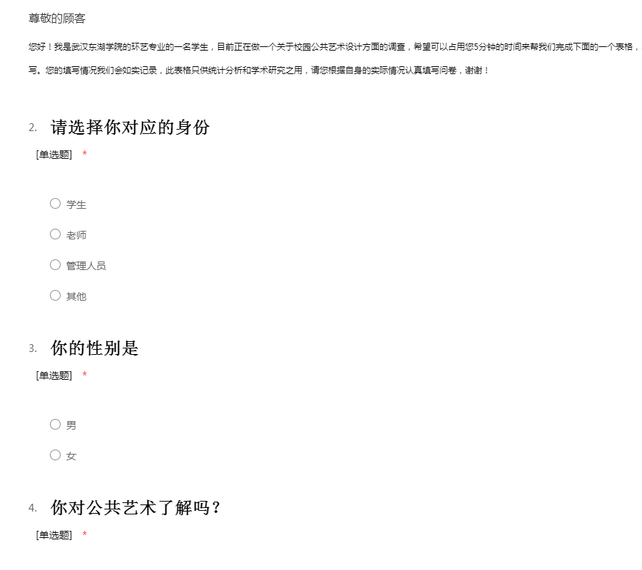 您好!我是武汉东湖学院的环艺专业的一名学生,目前正在做一个关于校园公共艺术设计方面的调查,希望可以占用您5分钟的时间来帮我们完成下面的一个表格,以下表格不会涉及到您的个人隐私,请放心填写。您的填写情况我们会如实记录,此表格只供统计分析和学术研究之用,请您根据自身的实际情况认真填写问卷,谢谢!