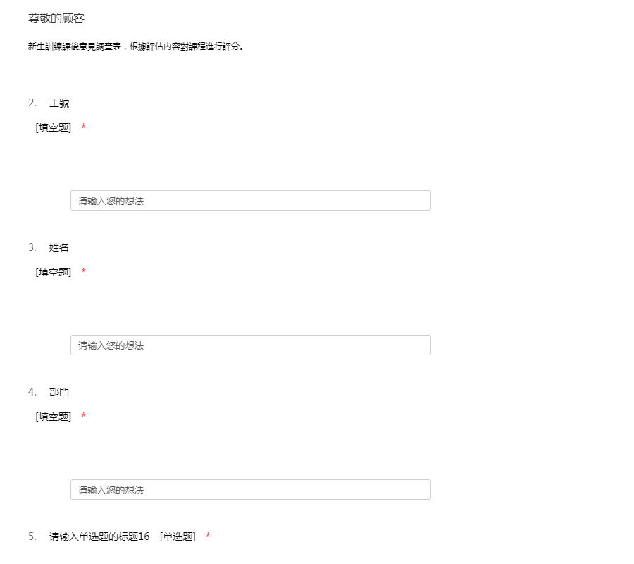 新生訓練課後意見調查表,根據評估內容對課程進行評分。