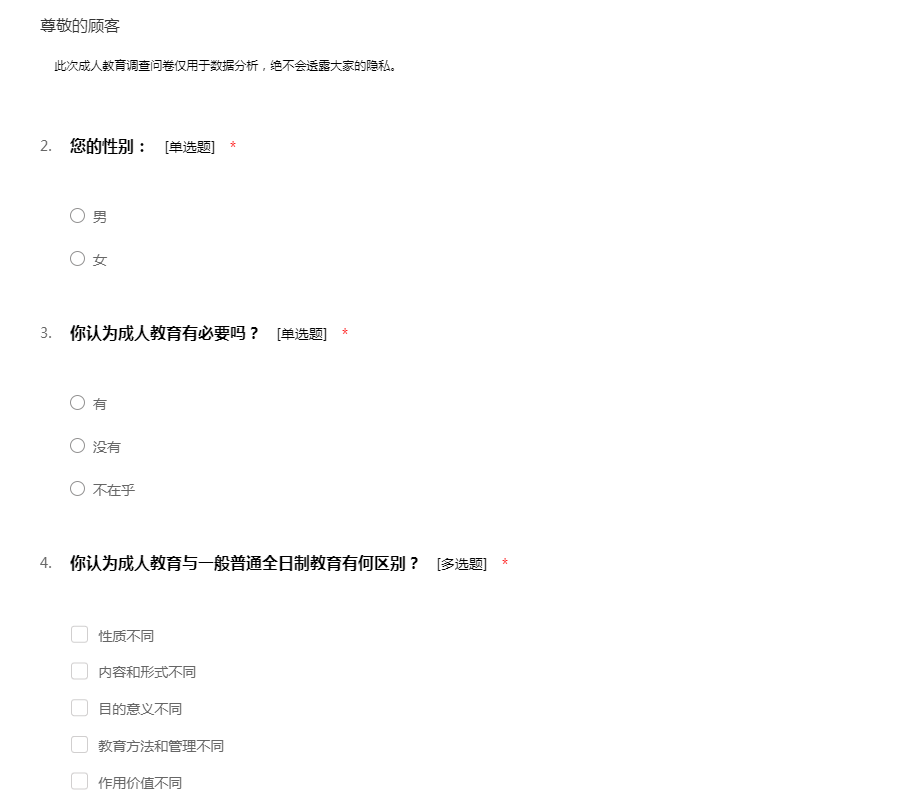 此次成人教育调查问卷仅用于数据分析,绝不会透露大家的隐私。