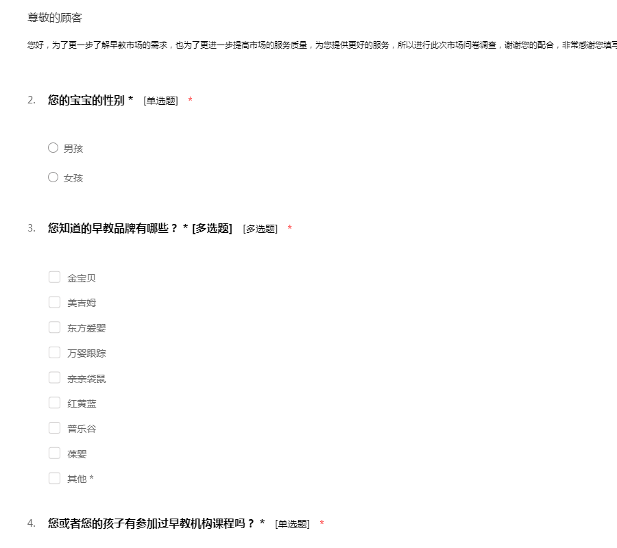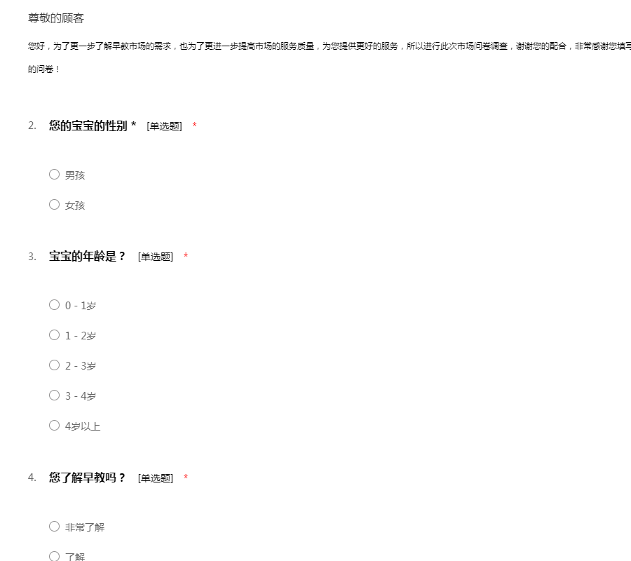 您好,为了更一步了解早教市场的需求,也为了更进一步提高市场的服务质量,为您提供更好的服务,所以进行此次市场问卷调查,谢谢您的配合,非常感谢您填写我们的问卷!