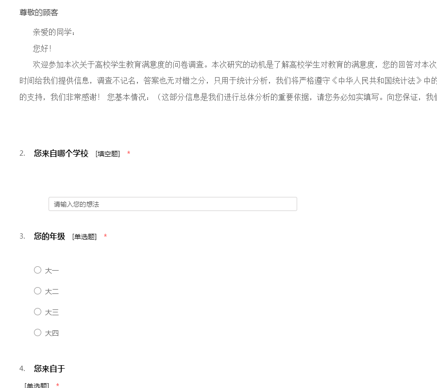 亲爱的同学: 您好! 欢迎参加本次关于高校学生教育满意度的问卷调查。本次研究的动机是了解高校学生对教育的满意度,您的回答对本次研究非常重要。希望您能抽出宝贵的时间给我们提供信息,调查不记名,答案也无对错之分,只用于统计分析,我们将严格遵守《中华人民共和国统计法》中的保密原则,请您放心填写。对于您的支持,我们非常感谢! 您基本情况:(这部分信息是我们进行总体分析的重要依据,请您务必如实填写。向您保证,我们将对这些信息保密)